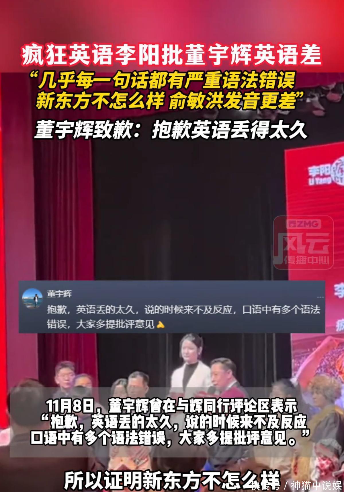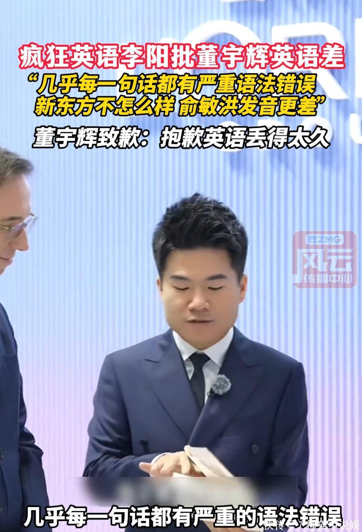 可让人没想到的是,看似“完美”的董宇辉,却一次又一次出现“翻车”行为。当天,李阳在发言时表示,自己之前听过一段董宇辉的演讲,在和国外的外交官交流时,董宇辉不仅发音很奇怪,而且几乎每一句都有不同程度上的语法错误。